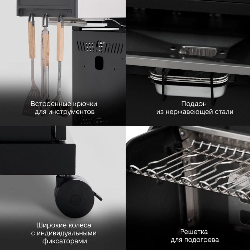 Уже в базе гриль укомплектован встроенной системой копчения PRIME SMOKER. Практичный и стильный штрих — термостойкий защитный коврик на пристолье.