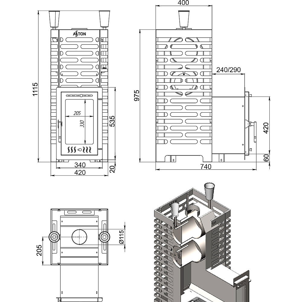- Печь ASTON из нержавеющий стали марки AISI 430 толщиной 4мм устойчива к окислению и прогару.