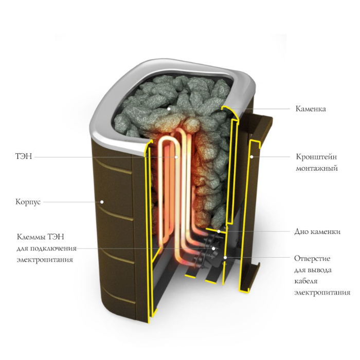 Для монтажа электрокаменки на стену парильного помещения в конструкции предусмотрен специальный кронштейн, закрепленный на задней стенке корпуса (входит в комплект поставки). Крепление печи к стене позволяет экономить место в сауне и делает ее уборку более доступной.
